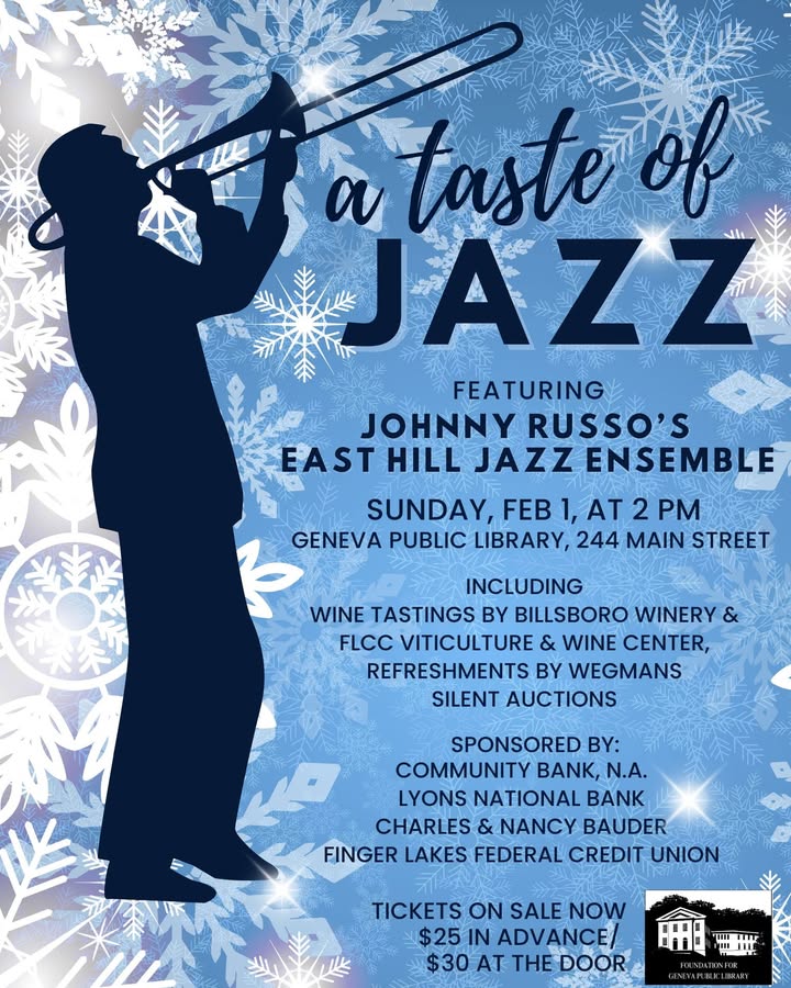 The Geneva Public Library is hosting a fundraiser called A Taste of Jazz on Sunday, February 1 at 2 pm at 244 Main Street. The event is organized by the Foundation for Geneva Public Library. Attendees can enjoy live music performed by Johnny Russo’s East Hill Jazz Ensemble. Wine tastings will be available from FLCC Viticulture and Wine Center and Billsboro Winery, and refreshments will be provided by Wegmans. In addition, a silent auction will offer items such as local theatre tickets and hand-crafted items. Tickets cost $25 in advance and $30 at the door. They are available at the library or online at gplny.org. Sponsors for the event include Community Bank, N.A., Charles & Nancy Bauder, Finger Lakes Federal Credit Union, and Lyons National Bank.
